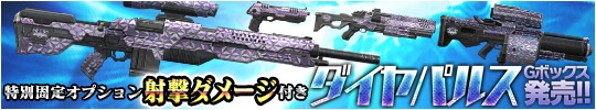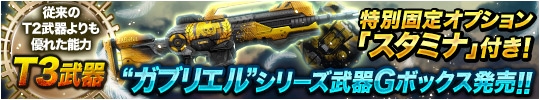 9月29日(火)メンテナンス後より、T3武器Gボックスの再販売を開始いたしました。T3武器レジェンドにはキャラクターの能力をアップする特別なオプションがついております。今回は3種類のシリーズを販売しておりますので自分のスタイルにあわせた武器をお選びいただけます。