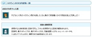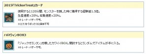 「かぼちゃ」と交換できる「ハロウィン文字BOX」からは彼女自作の不思議な「文字カード」が入っており、「Trick or Treat」となるように文字を集めると、ハロウィンにちなんだアイテムが当たる「ハロウィンBOX3」と、獲得経験値や採集速度を上昇させる「2015「Trick or Treat」カード」を彼女がプレゼントしてくれます。