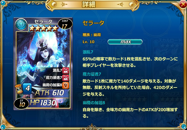 敵カード1枚に魔力で140ダメージを与える。対象が無敵、反射スキルを所持していた場合、420のダメージを与える。