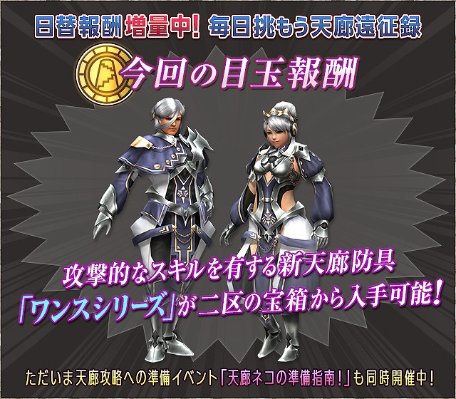 人気の「ノヴァエラ」(ライトボウガン)のカスタマイズ例紹介のほか、天廊攻略に役立つ装飾品の入手クエストをはじめ、「武器魂・綬・勲」が大量入手できるデイリークエストも配信中!この機会に天廊に挑み、ぜひ天廊武具を強化してみてください!