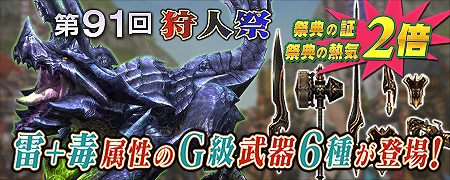 2015年10月28日より登録祭を開始した第91回「狩人祭」では、試練の対象となるモンスターに「ブラキディオス」が追加!「狩猟」することで、15魂入手することができます。さらに勝ち組褒賞には、「ストレガシリーズ」がG級武器として6種登場!猟団長は狩人祭への参加表明をお忘れなく!