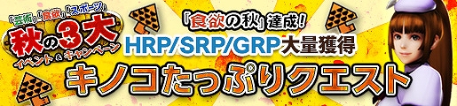 3つの「秋」をモチーフにした3大イベント&キャンペーンを順次開催中!本日からは、第2弾「キノコ狩り祭」において、キノコの納品数が20万本を達成したことの報酬として、HRP/SRP/GRP大量獲得の「キノコたっぷりクエスト」の配信を開始しました。