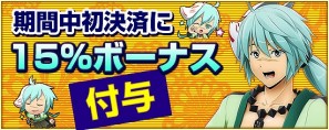 2015年10月29日(木)14:00 から 2015年11月26日(木)10:00 までの期間において、期間中の初決済に限り 15%の決済ボーナスを付与するキャンペーンを開催いたします!