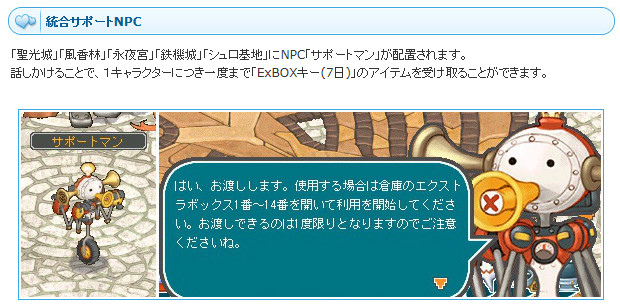 キャラクターの経験値管理が行いやすくなるように、「経験値2倍」「デスペナルティZERO」イベントを開催いたします。また、アイテム整理をしやすくため、各都市に設置されたNPC「サポートマン」より「ExBOXキー(7日)×5個」を1キャラクターにつき1度まで受け取ることができます。