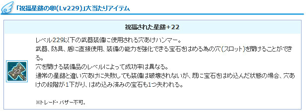 「祝福星槌の卵(Lv229)」の大当たりからは、Lv229以下の穴空けの際に装備品を保護してくれる安全安心の保障アイテム「祝福された星槌+22」が入手できる絶好のチャンスです!宝石を新たに装着してワンランク上の強さを手に入れたい方にはおススメのアイテムとなっておりますので、ぜひエンジェルモールをチェックしてくださいね!