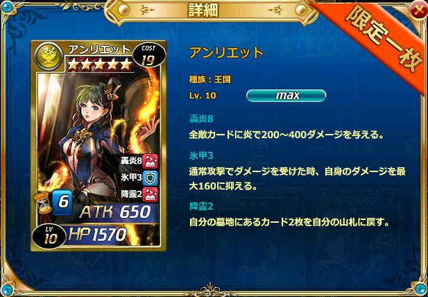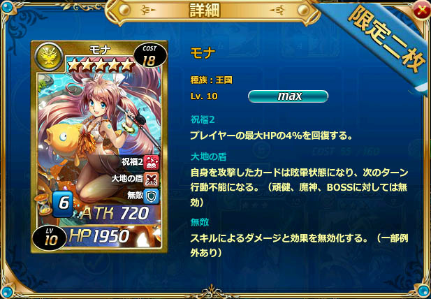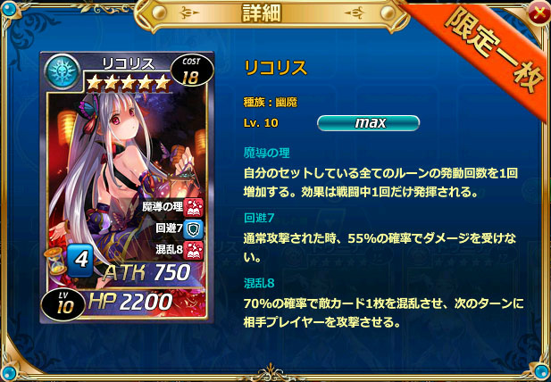 「超無敵・王祭」から出現する同じ★5カードの3枚目を獲得した時、謎の美女★5「リコリス」1枚をあなたの元へお届け。「リコリス」は、Lv0の状態でデッキ画面へ届きます。「モナ」「アンリエット」「テュール」それぞれ1度ずつ合計3枚、特典を獲得できます。