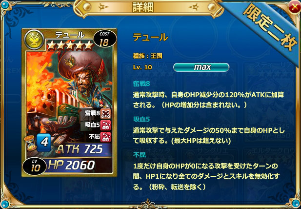 1度だけ自身のHPが0になる攻撃を受けたターンの間、HP1になりすべてのダメージとスキルを無効化する。(粉砕、転送を除く)