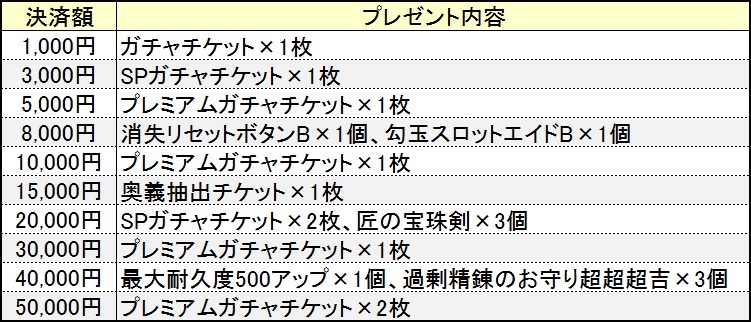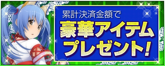 2015年11月26日(木)14:00から2015年12月24日(木)10:00までの期間において、累計決済金額に応じて豪華アイテムをプレゼントするキャンペーンを開催いたします!累計決済金額とそれに対応するプレゼント内容は以下のものとなります。