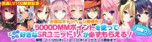 団長LV上限100解放を記念して、1回限りのお得なキャンペーンを開催!期間中に「5000」DMMポイントを使うと、キャンペーン任務が達成でき、報酬として「キャンペーンボックス」が獲得できます。「キャンペーンボックス」を使用すると下記のうち好きなSRユニットを1名獲得できます!