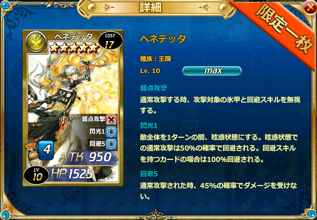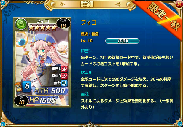 「超無敵・王祭」から出現する同じ★5カードの3枚目を獲得した時、謎の美女★5「リコリス」1枚をあなたの元へお届け。「リコリス」は、Lv0の状態でデッキ画面へ届きます。「フィコ」「ベネデッタ」「エンジェーニ」それぞれ1度ずつ合計3枚、特典を獲得できます。