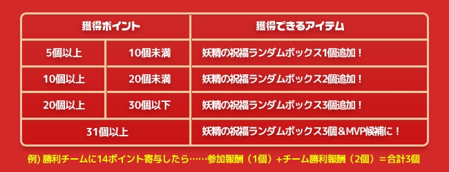 所属チームがその日勝利した場合、その日に集めた数によって追加で「妖精の祝福の箱」をもらえます。
