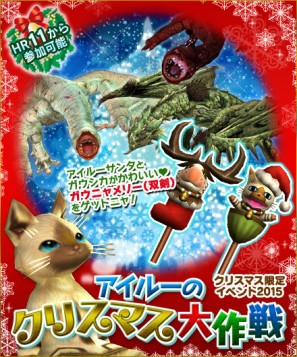 今年のクリスマスは、アイルーと一緒にクリスマスツリーを作ろう!材料はなんと………モンスター!?初登場のイベント武器「ガウニャメリー」(双剣)をはじめ、「ガウシカシリーズ」「サンタシリーズ」などの歴代クリスマス武具を入手しよう!