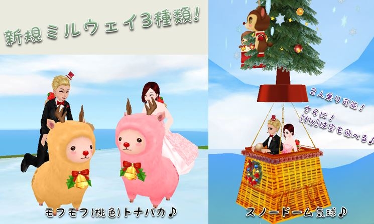 「モフモフトナパカ」「桃色トナパカ」に乗って、冬の散歩を楽しみましょう。さらに、2人で乗れる「スノードーム気球」も追加されました。
