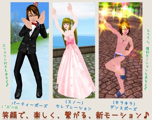 「Xmasブライダルドレス(タキシード)」などの着用アイテムなどが追加されました。新作モーションも追加され、より楽しくコミュニケーションができます。