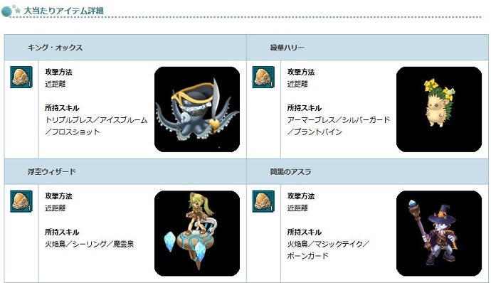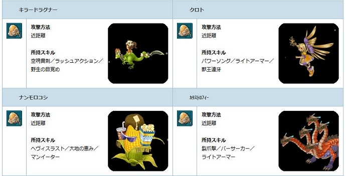 「融合ペットの卵 2015」の大当たりからは、「野生の目覚め」「空鳴貫刺」の物理スキルでサポートしてくれる「キラードラグナー」や、「大地の恵み」「マンイーター」などのスキルで生存力が高く、頼れるトウモロコシ型のペット「ナンモロコシ」が入手できる絶好のチャンスです!ぜひこの機会にエンジェルモールをチェックしてください。