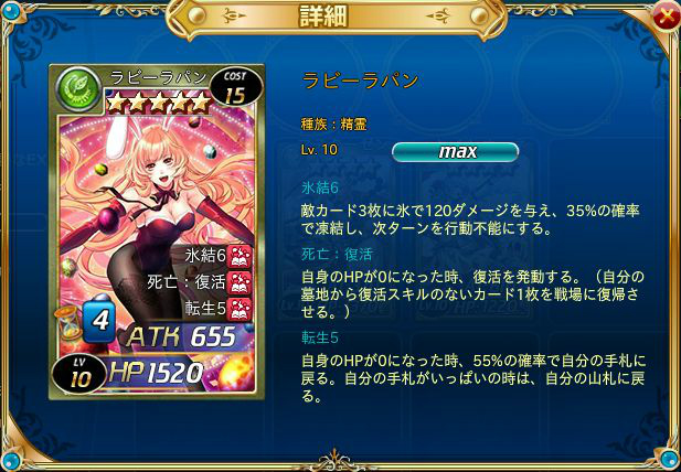 自身のHPが0になった時、55%の確率で自分の手札に戻る。自分の手札がいっぱいの時は、自分の山札に戻る。