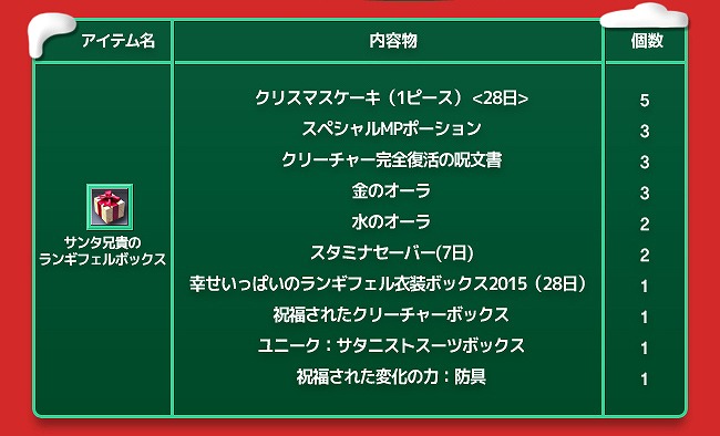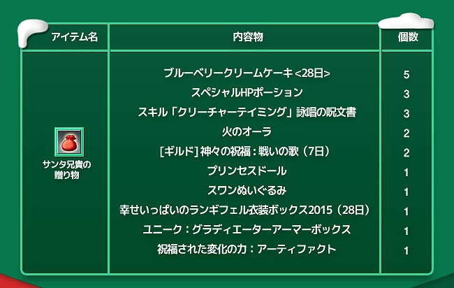 「おもちゃの部品」を3,000個集めてチョイ悪サンタ兄貴に持っていくと、「サンタ兄貴の贈り物」を獲得できます。「サンタ兄貴の贈り物」は20日間の期間制アイテムで、20時間毎に1度開けることが出来、以下の表のいずれかのアイテムを1つ獲得できます。