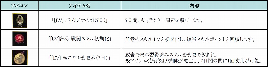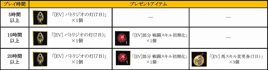 ※20時間以上プレイいただくとすべてのアイテムがプレゼントされます。(5時間以上、10時間以上分のアイテムは重複してプレゼントされません。)
