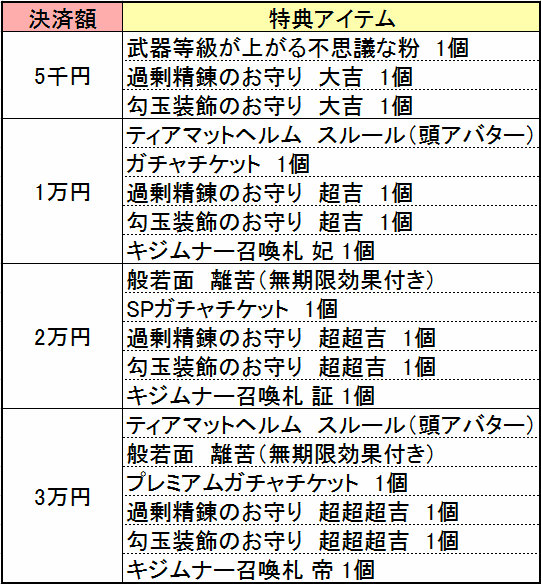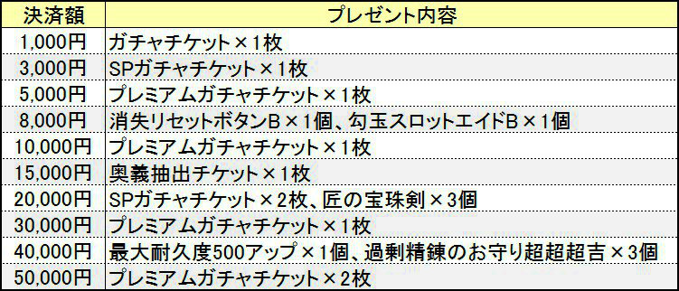 2015年12月24日(木)14:00から2016年1月14日(木)10:00までの期間において、累計決済金額に応じて豪華アイテムをプレゼントするキャンペーンを開催いたします!累計決済金額とそれに対応するプレゼント内容は以下のものとなります。