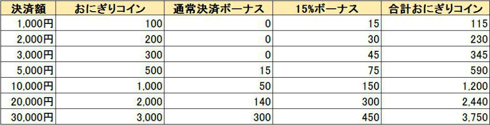 期間中の初決済となっておりますので、今まで課金決済いただいていたアカウントも対象となります。決済金額に対応するおにぎりコインの内容は以下のものとなります。