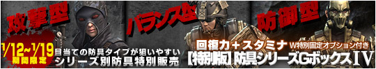1月12日(火)メンテナンスより、2種類の【特別版】防具シリーズGボックスの再販売を開始いたしました。今回の防具シリーズGボックスは、ゲーム内で人気の高い回復力と徐々に注目を集めている連射力のオプションが付いた防具シリーズ【特別版】GボックスIIIと回復力に近接武器やダッシュなどに消費するスタミナがアップする【特別版】防具シリーズGボックスIVです。期間限定の販売となっておりますので、ぜひこの機会をお見逃しなく。