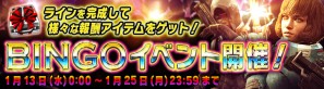 1月13日(水)0:00より、初WEBイベント「BINGOイベント」を開催いたしました。「BINGOイベント」はゲーム内ログインやミッションクリアなど条件を達成することでラインを完成し、完成したラインの数に応じてさまざまな報酬アイテムを獲得できるイベントとなっております。