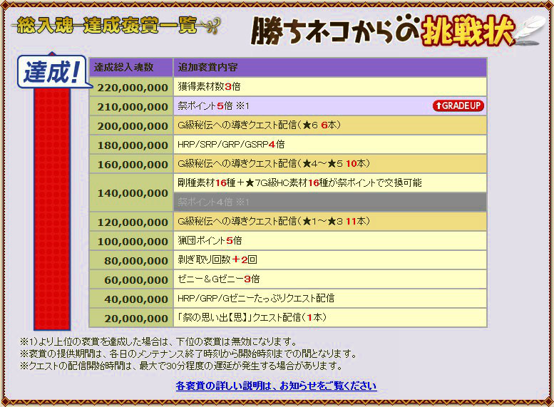 全サーバーの目標の入魂数で目指す、第93回狩人祭「勝ちネコからの挑戦状」にて、見事すべての目標が達成されましたため、以下の達成褒賞を配信いたします!