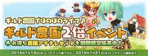 2016年1月14日(木)定期メンテナンス後から、「ギルド農園2倍イベント」開催いたします。イベント期間中、「水やり」「肥料」「採集」で獲得できる経験値と技法経験値が2倍になります!