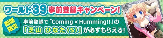 期間中ワールド39に事前登録していただいた方全員に、「Coming×Humming!!」の「芝山 ひなた(S)」をプレゼント!
