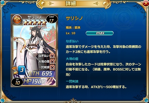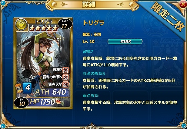 通常攻撃時、戦場にある自身を含めた味方カード一枚毎にATKが110増加する。