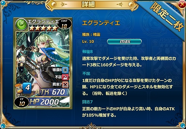 1度だけ自身のHPが0になる攻撃を受けたターンの間、HP1になりすべてのダメージとスキルを無効化する。(粉砕、転送を除く)