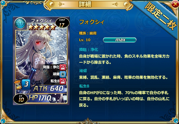 自身のHPが0になった時、70%の確率で自分の手札に戻る。自分の手札がいっぱいの時は、自分の山札に戻る。