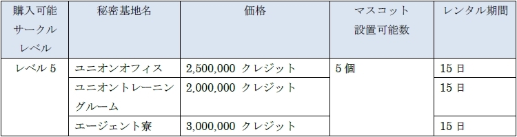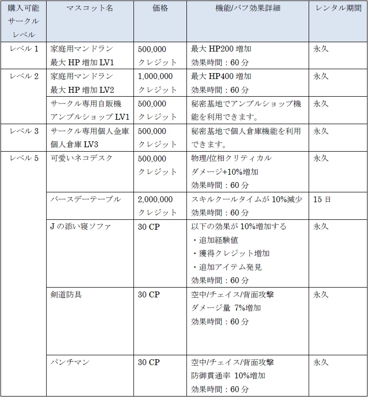 今回の「サークル大改変」では、サークルレベルを上げるために必要な「サークルメモリーブック」が入手しやすくなったほか、強力なバフが適用される新たな「マスコット」の追加や、新しい「秘密基地」の追加などを行っています。