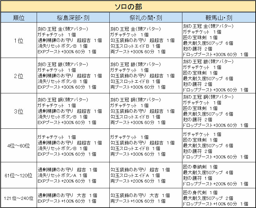 対象のダンジョンは「ソロの部」と「パーティーの部」で別れており、イベント景品はそれぞれ以下の通りとなります。