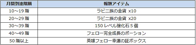 ミッション1「週間チャレンジ!」各週の最高クリア階層を合計した数を「月間クリア階層」とし、各キャラクターの月間クリア階層に応じて、報酬をプレゼントします。