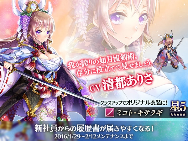 今回追加された社員「アニエス・バリエ」、「ミコト・キサラギ」からの履歴書が期間限定で届きやすくなります。毎日ログイン時に受け取れる履歴書の中に新社員からの履歴書が入っていることもあります。