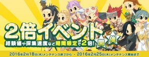 2016年2月18(木)定期メンテナンス後から、「経験値&採集速度 2倍イベント」開催いたします。期間中、モンスター撃破時の経験値や技法経験値、採集・生産速度が2倍になります!