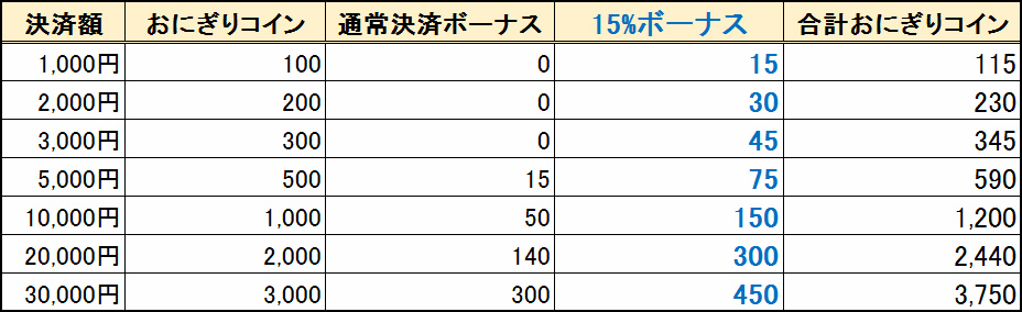 期間中の初決済となっておりますので、今まで課金決済いただいていたアカウントも対象となります。決済金額に対応するおにぎりコインの内容は以下のものとなります。