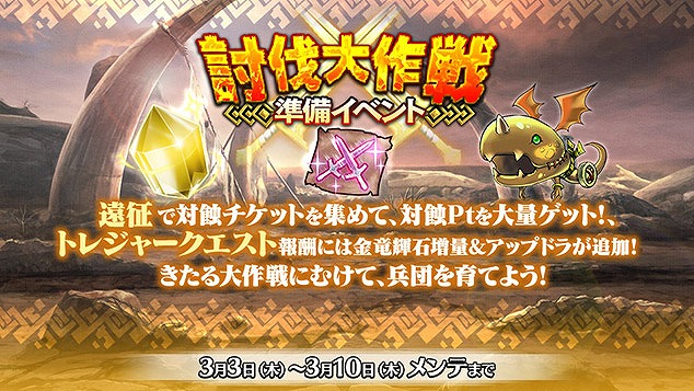 竜の骸を開拓して見つけた「トレジャーマップ」を使用して、トレジャークエストに出撃しよう!期間中は、トレジャークエストでの「金竜輝石」(武器強化素材アイテム)ドロップ数がアップ!また、「アップドラ」(バトル中に使用すると味方全員の能力アップ)もドロップするぞ!