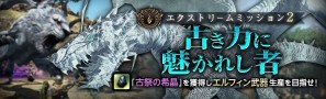 3月24日(木)より、エクストリームミッション2「古き力に魅かれし者」を解禁しました。最大4人のプレイヤーで「古の祭祀場」へ向かい、そこに集いしモンスターに挑みます。報酬では、LV60武器の生産に必要な「古祭の希晶」が獲得できます。
