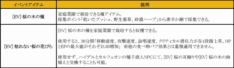 「乾いたブッシュ、野生薬草、砂漠ハーブ」から[EV]桜の木の種を採集。家庭菜園で[EV]桜の木の種を栽培。成長に応じて桜の木も変化!満開になったら[EV]枯れない桜の花びらを収穫。
