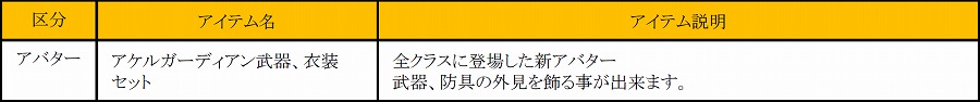 本日より登場した新便利アイテムには、全クラスにヘルムの羽根や背中のマントが特徴的な鎧風アバター「アケルガーディアン」が登場。ウォーリア、ソーサレスの覚醒武器のアバターももちろんご用意しております。