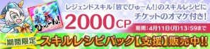 期間限定!「スキルレシピパック【支援】」を2000CPで販売!レジェンドスキル「皆でびゅーん!」のスキルレシピに召喚くじプラチナチケットのオマケ付き!ショップ内「アイテム屋」でご購入できます。