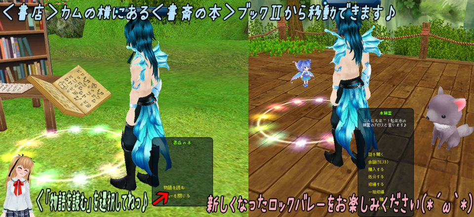 <書斎の本>ブックⅡから移動できる「ロックバレー」マップがリニューアルしました。新しくなった「ロックバレー」は釣りや採集を楽しめるようになり、新NPC:<水精霊>アイリスも期間限定で追加されました。