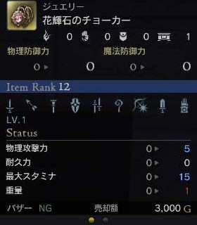 「花輝石のチョーカー」はクラフトでは生産できないジュエリーです。装備可能LV1、物理攻撃+5、最大スタミナ+15の性能を持っています。