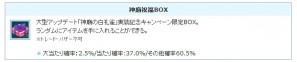 2016年4月14日(木)定期メンテナンス後から、「神廟の白孔雀」実装を記念して「神廟の白孔雀チャージキャンペーン」を実施いたします。期間中、UJJ コインを購入し、一定額のエンジェルポイント(AP)をされたアカウントに「神廟祝福 BOX」をプレゼントいたします。
