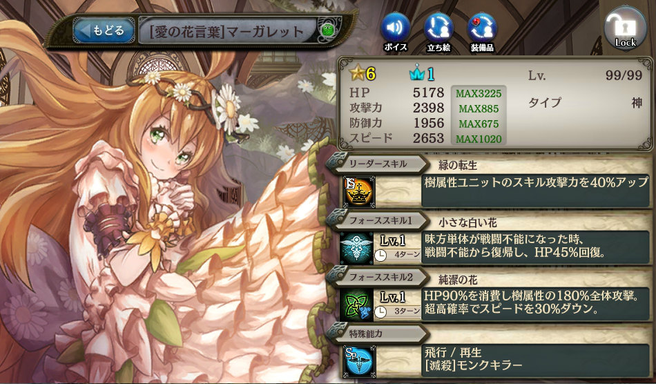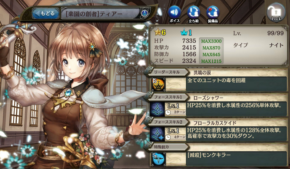 進化後は幻獣契約後に比べスピードが高くなり、自動蘇生と全体回復スキルを所持。幻獣契約後は自身のHPを90%消費し、全体ダメージとスピードダウンを与えるスキルを所持。