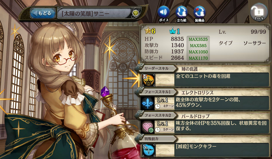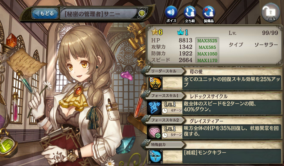 敵のステータスをダウンさせるスキルと、味方全体のHP・状態異常を回復するスキルを所持。