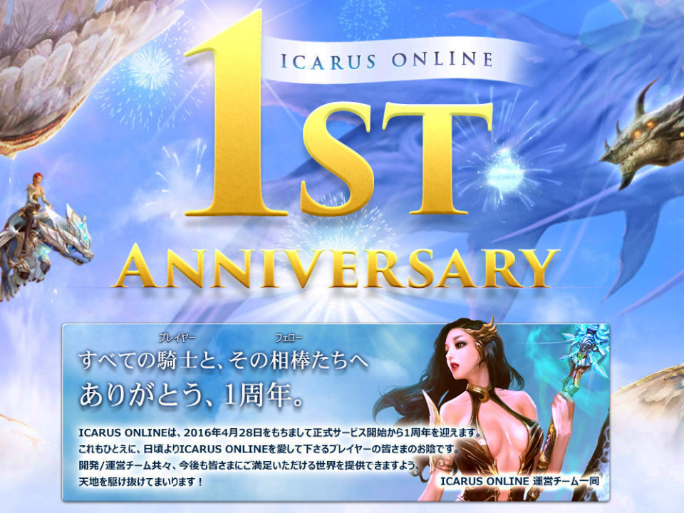 2015年4月28日の正式サービス開始から「ICARUS ONLINE」は一周年を迎えます。一周年を記念し、本日「ICARUS 1st ANNIVERSARY」特設サイトを公開し、「フェロー」関連コンテンツが多数新登場する「牧場~フェローが飛び交う緑の大地~」アップデートを2016年4月28日(木)に実施すると発表しました。