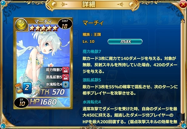 敵カード3枚に魔力で140ダメージを与える。対象が無敵、反射スキルを所持していた場合、420のダメージを与える。